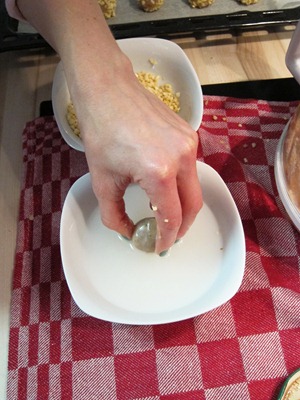 Der Keksteig ist an sich ganz einfach in der Küchenmaschine oder mit dem Handrührgerät gemacht. Als besonderes Extra haben die Kekse aber noch eine Mandelkruste bekommen. Dafür wurde jede Keksteigkugel in Wasser getunkt und anschließend in gehackten Mandeln gewälzt.