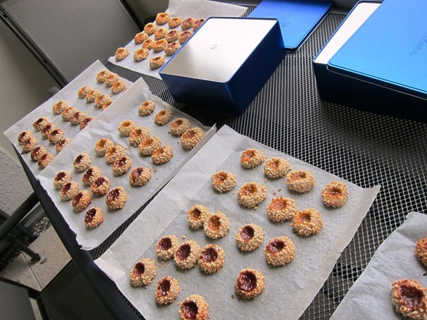 … die Vertiefungen für die Marmelade gemacht werden. Das ging am besten mit einen angefeuchteten kleinen Finger.