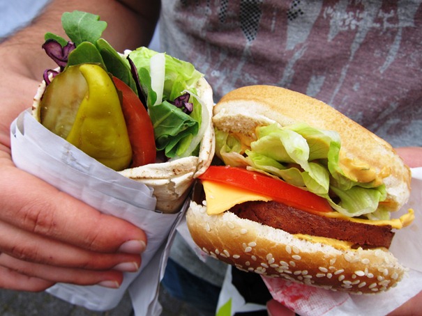Wir haben es uns nicht nehmen lassen, beim veganen Fast Food zuzuschlagen: Cheeseburger für ihn, Veggie-Hummus-Wrap für sie. Beides lecker!